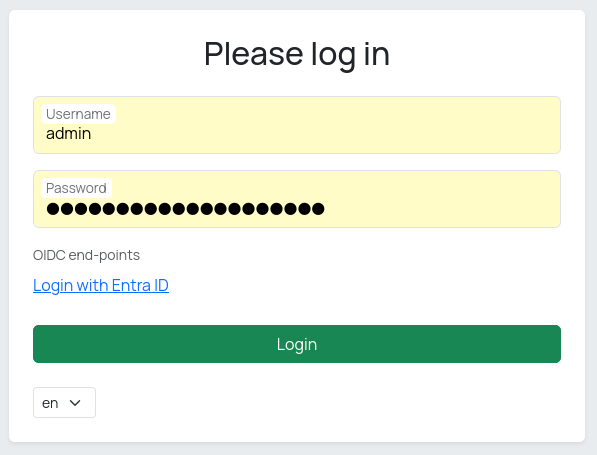 When you open the admin UI login page, you will see a Login with Entra ID option on the login page. Selecting this option starts the OpenID Connect (OIDC) sign-in process.