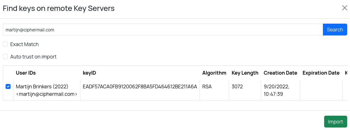 You can store public keys on external key servers. This makes it easier for recipients to find keys for users outside your organization. To search for keys, open the Search keys page by selecting https://keys.openpgp.org.