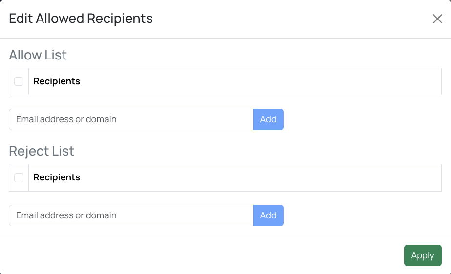Allowed list: recipients (domains or specific addresses) you can send to.