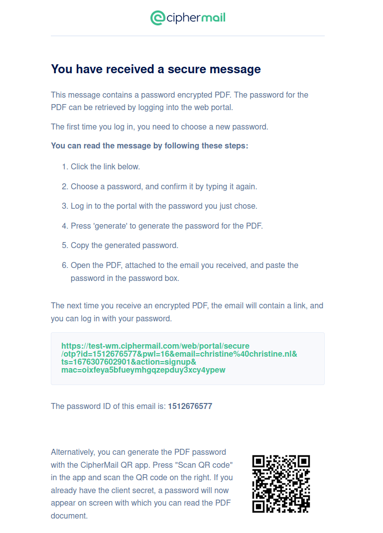 Ciphermail PDF Authenticator lets you generate a password for an encrypted PDF document you have received via Ciphermail. This is an example of such an email: