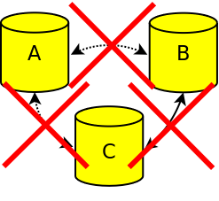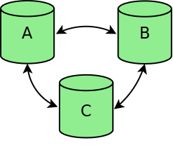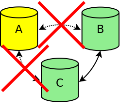 If node A can no longer communicate with node B and C, because for example there is a network failure node A’s data center, the node is removed from the cluster. The node will no longer accept incoming connections. Because the two other nodes still have a quorum (2 out of 3), the cluster is still active. Nodes B and C will continue to function and will replicate all changes between the two nodes. If the connection between node A and the other nodes is restored, node A will automatically connect to the other two nodes and will be synchronized to make the node up-to-date again.
