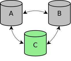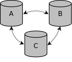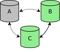 If one node is stopped in a controlled way, for example for maintenance or because of a reboot, the node is gracefully removed from the cluster. The cluster size is reduced to a two node cluster (see figure cluster-one-node-stopped-figure). Nodes B and C will continue to function and will replicate all changes between the two nodes. If node A is restarted, node A will automatically connect to the other two nodes and will be synchronized to make the node up-to-date again.