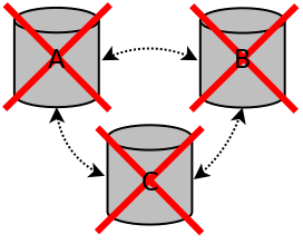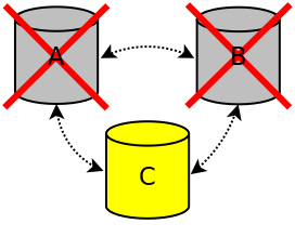 If node A is terminated in an ungraceful way, for example the node crashed or there was a power outage, the node is removed from the cluster. Because the two other nodes still have a quorum (2 out of 3), the cluster is still active (see figure cluster-one-node-terminated-figure). Nodes B and C will continue to function and will replicate all changes between the two nodes. If node A is restarted, node A will automatically connect to the other two nodes and will be synchronized to make the node up-to-date again.