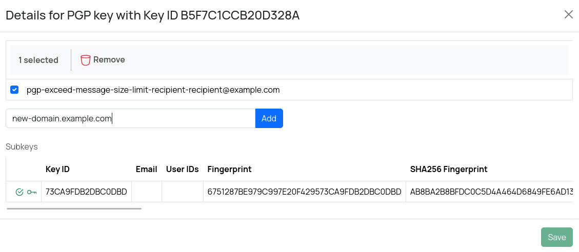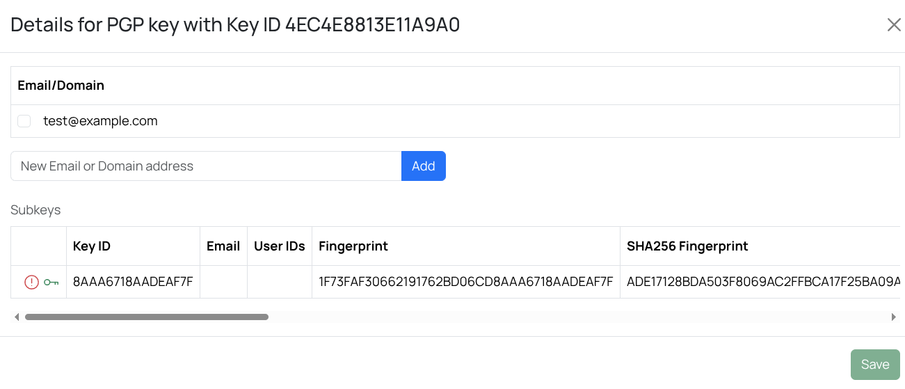 To manage the associated email/domain addresses, click a key and add or remove additional email addresses or domains.