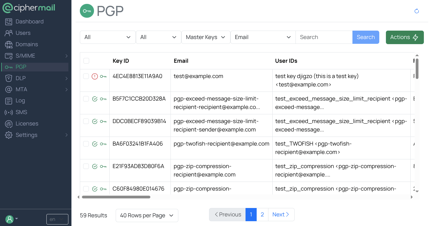You can store public keys on external key servers. This makes it easier for recipients to find keys for users outside your organization. To search for keys, open the Search keys page by selecting . The default configured keyserver is https://keys.openpgp.org.