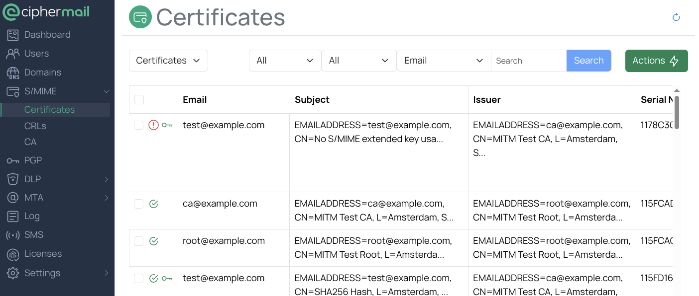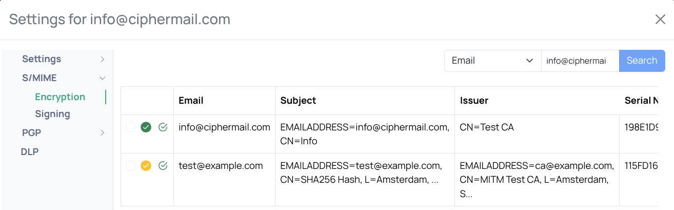 On this page, you will see a list of all encryption certificates currently selected for the user or domain. By default, when a user was selected, the system only displays certificates that include email addresses matching the user.