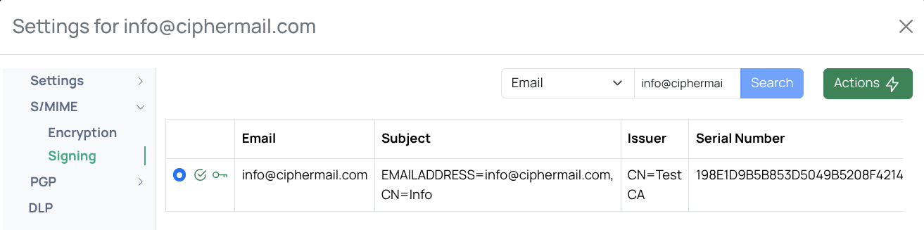 Only certificates that include a private key can be selected, and each user can have only one signing certificate selected at a time. The system will try to choose a signing certificate automatically by looking for a valid certificate that matches the user’s email address. If more than one certificate is suitable for signing, the first one found will be selected.
