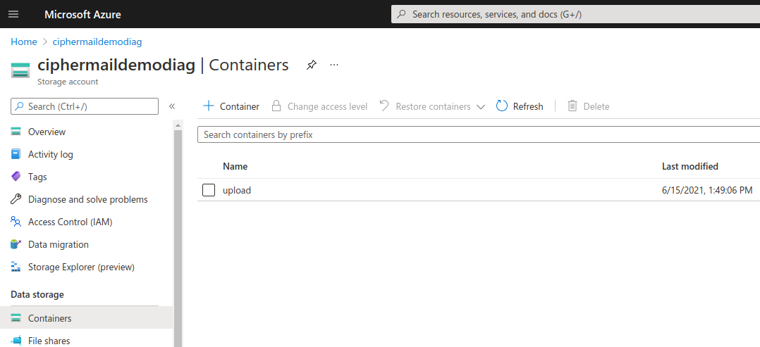 On the storage account page, select a container (see screenshot). If there is no container yet, create a new container with the name upload.