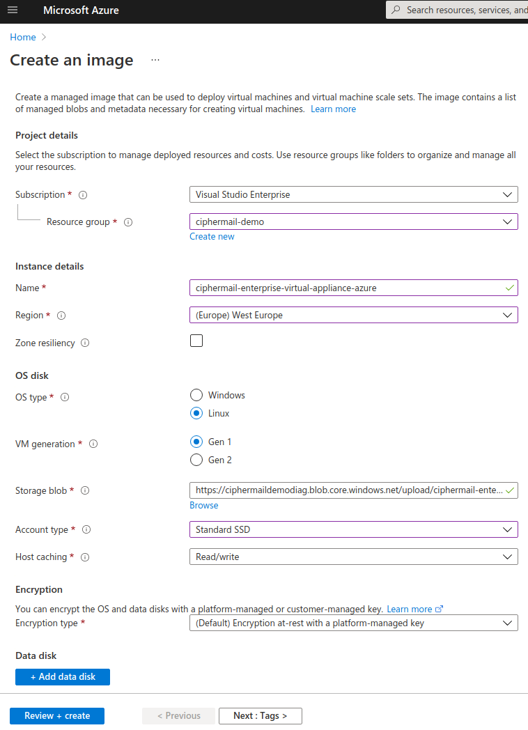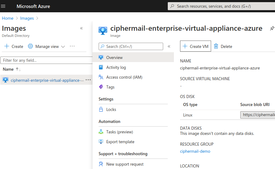The following steps will explain how to import a CipherMail appliance into Azure.